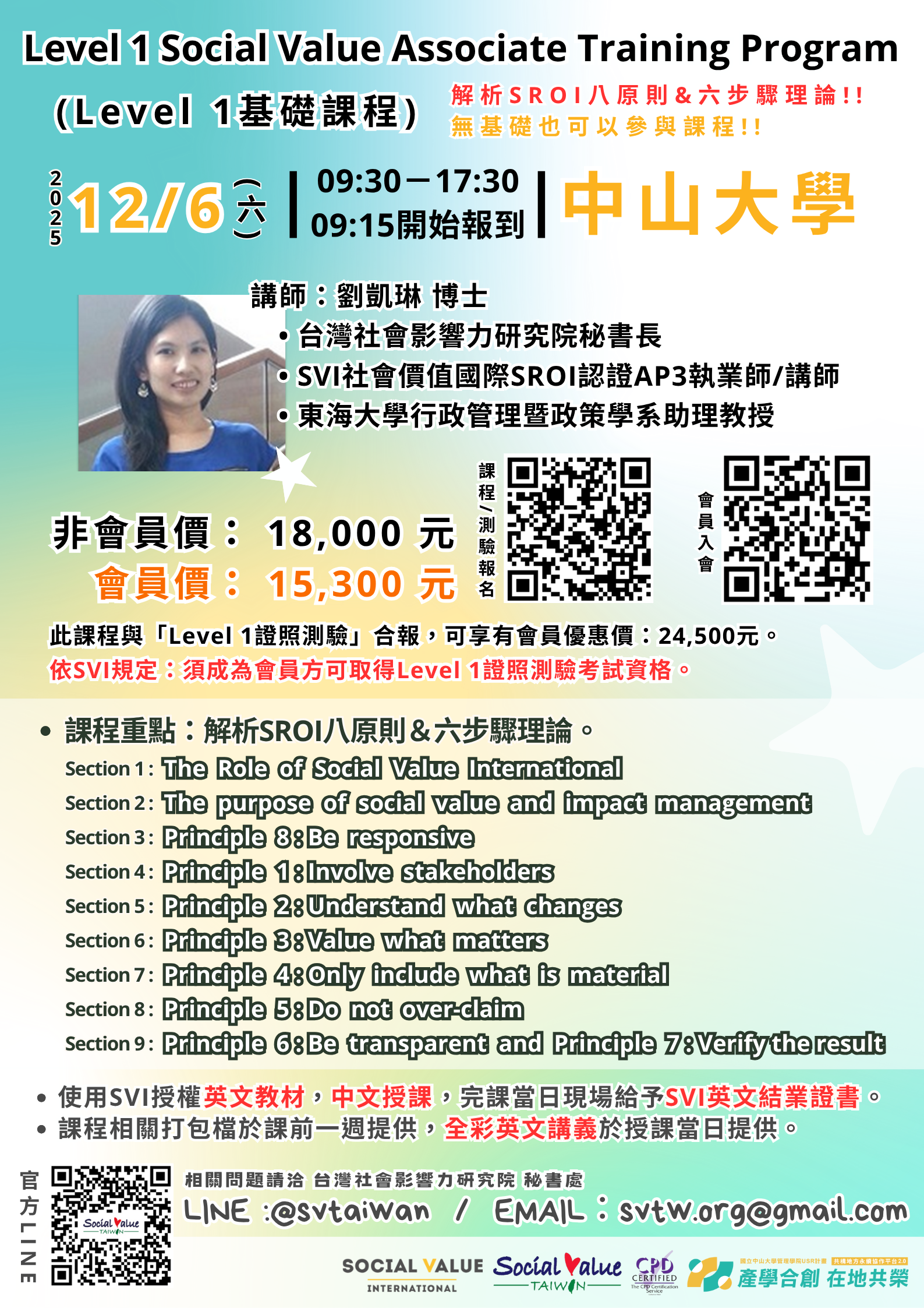 12/6(六)由劉凱琳博士在中山大學一起解析SROI八大原則&六大步驟理論。