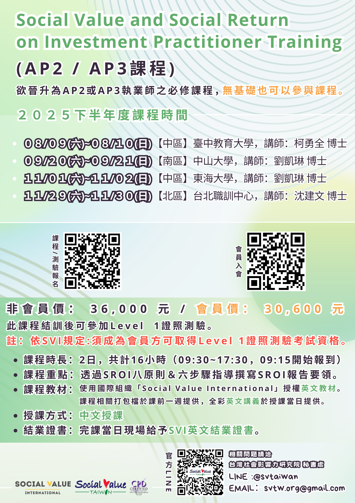 【公告】2025年下半年度【AP2/AP3課程】時程表 Jul 07, 25 分享 分享 分享到 網址 general.share.close general.share.copy_to_clipboard 【公告】2025年下半年度【AP2/AP3課程】時程表Social Value and Social Return on Investment Practitioner Training(AP2/AP3課程)課程報名請點https://www.socialvalue.org.tw/collections/two加入會員,專屬優惠提供給您https://forms.gle/AmzWQ53Ru3Hd6kWm8 #SROI #社會 #投資報酬率 #影響力 #評估 相關商品 售完 8/9(六)-8/10(日) 【中區】Social Value and Social Return on Investment Practitioner Training Regular price NT$ 36,000.00 Sale price NT$ 36,000.00 Regular price NT$ 36,000.00 售完 9/20(六)-9/21(日)【南區】Social Value and Social Return on Investment Practitioner Training Regular price NT$ 36,000.00 Sale price NT$ 36,000.00 Regular price NT$ 36,000.00 11/1(六)-11/2(日)【中區】Social Value and Social Return on Investment Practitioner Training Regular price NT$ 36,000.00 Sale price NT$ 36,000.00 Regular price NT$ 36,000.00 11/29(六)-11/30(日)【北區】Social Value and Social Return on Investment Practitioner Training Regular price NT$ 36,000.00 Sale price NT$ 36,000.00 Regular price NT$ 36,000.00 返回