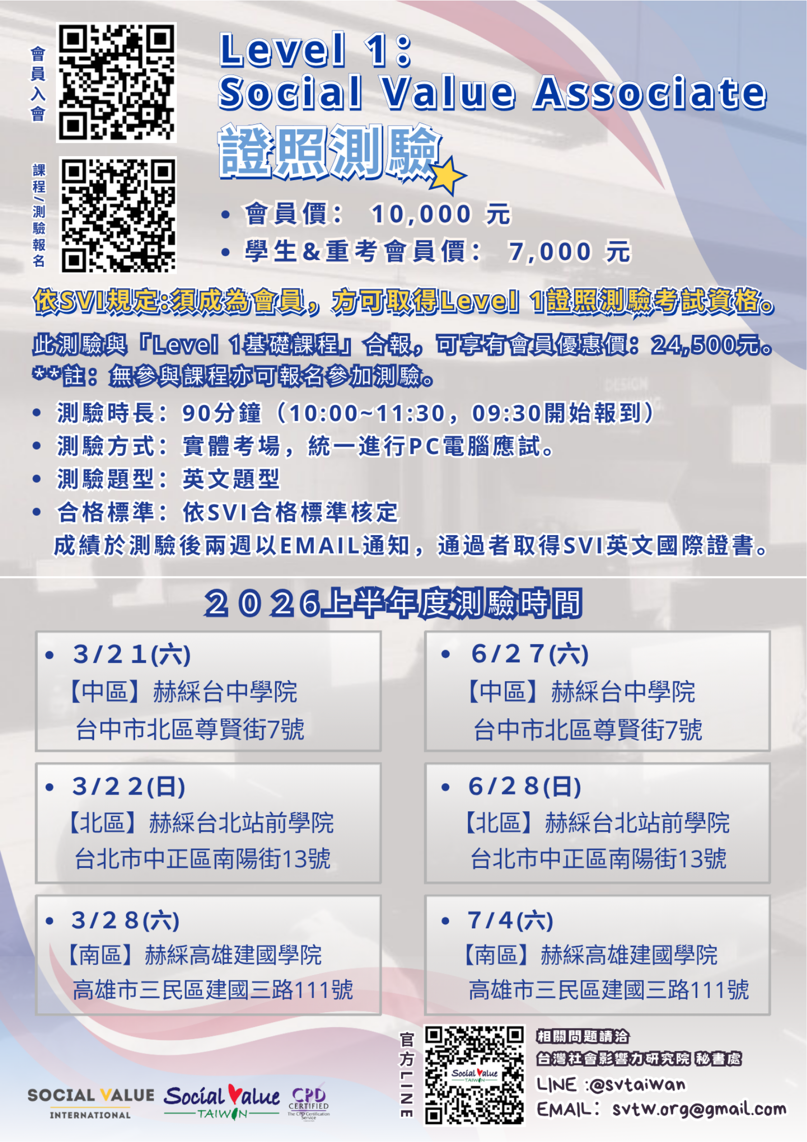 【公告】2026年上半年度【Level 1證照測驗】時程表 Oct 31, 25 分享 分享 分享到 網址 general.share.close general.share.copy_to_clipboard 【公告】2026年上半年度【Level 1證照測驗】時程表Level 1:Social Value Associate證照測驗Level 1證照測驗報名請點https://www.socialvalue.org.tw/collections/test加入會員,專屬優惠提供給您https://forms.gle/tdEES4pB9v6r8za2A #SROI #社會 #投資報酬率 #影響力 #評估 返回