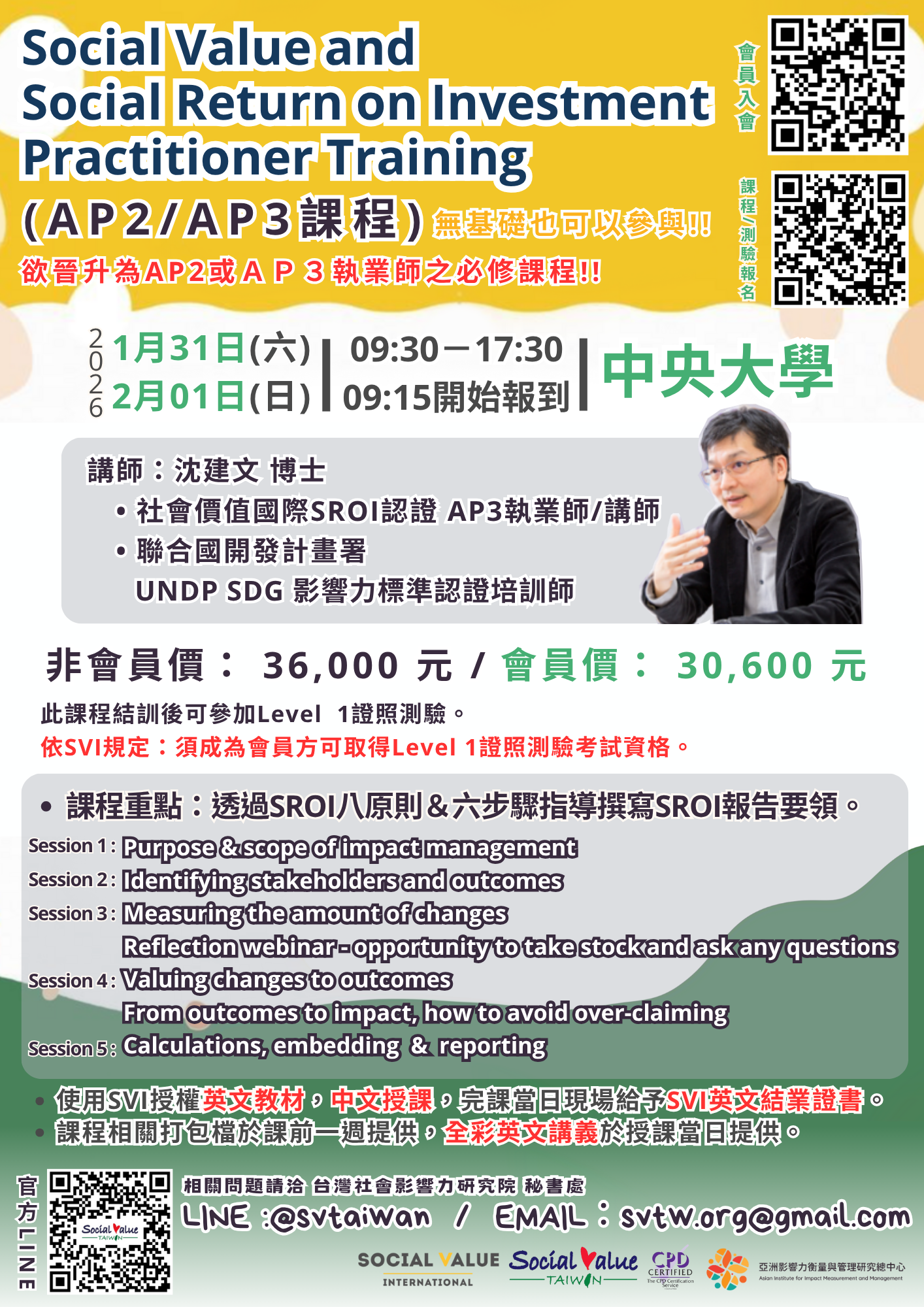 1/31(六)-2/1(日) 和沈建文博士在中央大學一起探索SROI的世界。